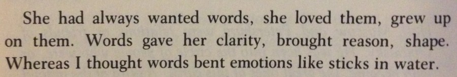 “She had always wanted words, she loved them, grew up on them. Words gave her clarity, brought reason, shape. Whereas I thought words bent emotions like sticks in water.”